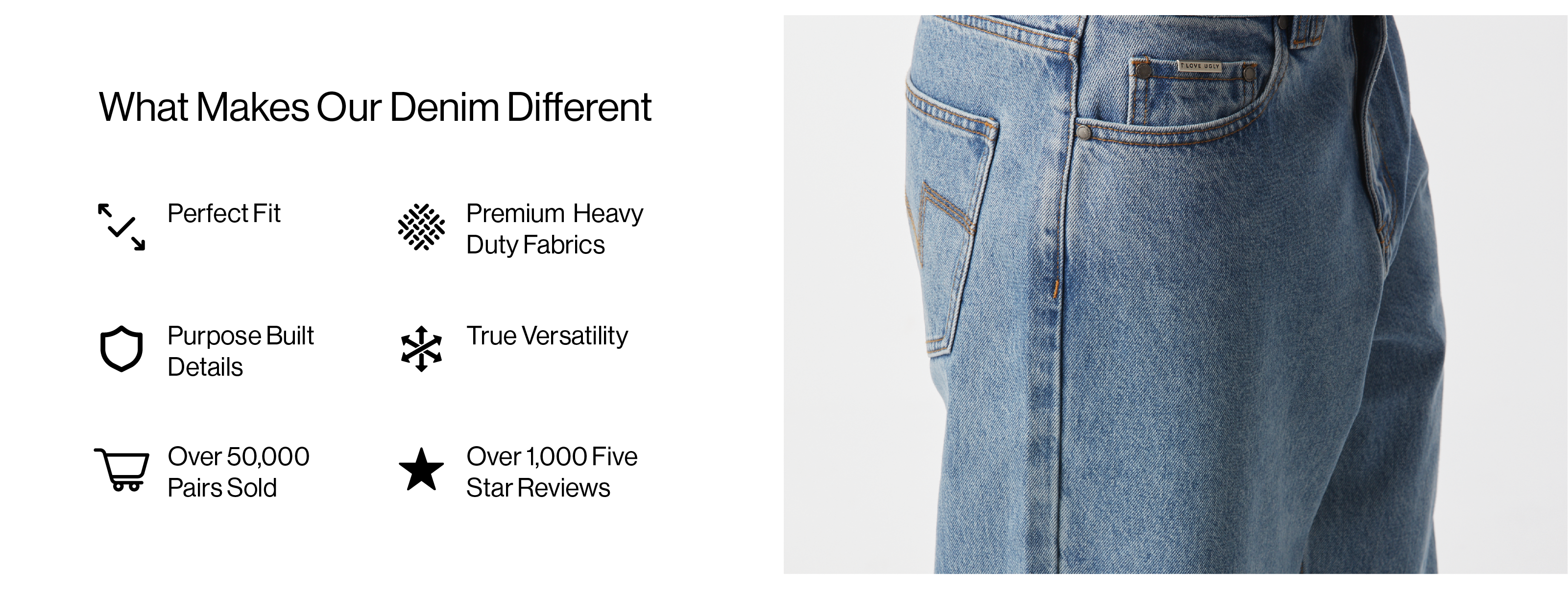 We've spend 14 years perfecting the formula. Every pair of I Love Ugly Denim is a product of purpose. Made for real people.